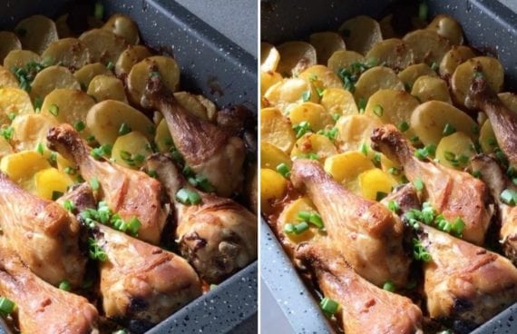 Pečené kuracie stehná so zemiakmi z jedného plechu