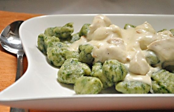 Špenátové halušky s cesnakovou omáčkou a kuracím mäsom