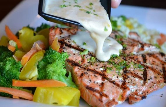 Grilovaný losos so zemiakovou kašou a omáčkou