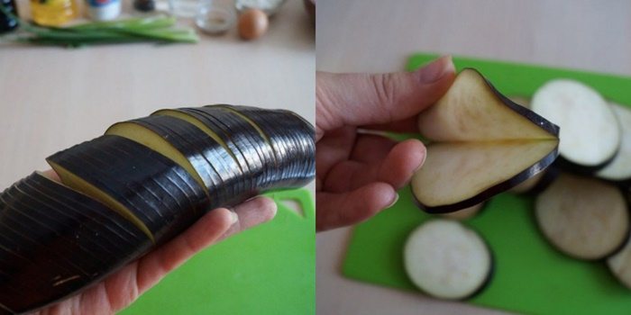 Baklažán si zvrchu opláchnite a osušte. Do celého baklažánu urobte zárezy, ako vidíte na obrázku, no dbajte, aby baklažán držal pokope, nesmie sa rozpadnúť. Dostanete niečo ako harmoniku. Potom ich rozkrájajte na dvojice, teda tak, aby ostali vždy dva kúsky spojené. Posypte ich soľou a nechajte stiecť z vody.