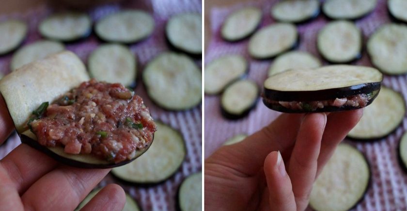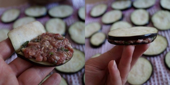 Pripravte si mäsovú plnku. Zmiešajte hovädzie a bravčové mäso, osoľte a okoreňte, pridajte na drobno nasekanú zelenú cibuľku, sójovú omáčku, sezamové semienka a dobre premiešajte. Do každej dvojice baklažánu dajte približne za lyžicu mäsovej plnky.