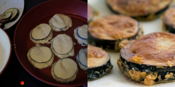 Na záver si pripravte cestíčko zmiešaním múky, vajca a mlieka, alebo jogurtu. Naplnené baklažány do neho namočte a vyprážajte v horúcom oleji 3-5 minút z každej strany. Podávajte ešte horúce so studeným jogurtovým dresingom. Prajeme dobrú chuť!