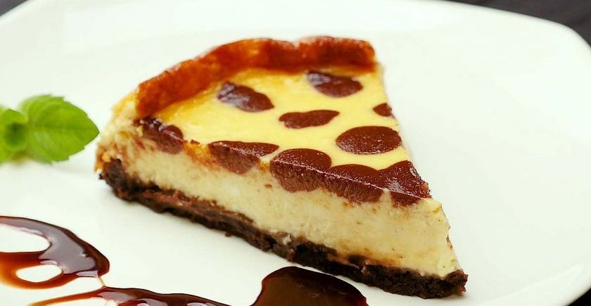 Bielu plnku vylejte do tortovej formy. Hnedú plnku si dajte do cukrárskeho vrecka a na povrch bielej plnky vytláčajte hnedé krúžky. Môžete ich vytláčať náhodne, alebo urobiť vlastný kreatívny obrazec. Hrot cukrárskeho vrecka ale musíte ponoriť máličko hlbšie do tvarohu a kým ešte tlačíte pomaly ho vysúvať. Iba tak sa čokoláda dostane až dovnútra bielej plnky a zároveň ostane zarovno s ním aj na povrchu.