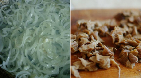 Hríby alebo šampiňóny si nakrájajte na jemné a dajte smažiť. Do misky si medzitým nakrájajte cibuľu na polovičné prúžky, nasekajte kôpor podľa toho, koľko máte radi a pridajte podusiť k hríbikom. Všetko dobre premiešajte a odstavte, keď budú hríbiky hotové. Plnku do mäsa máte pripravenú.