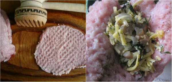 Karé si nakrájajte na tenšie rezne a dobre vyklepte. Osoľte a okoreňte. Do každého plátku vložte polievkovú lyžicu hríbovej plnky a zabaľte do rolky.