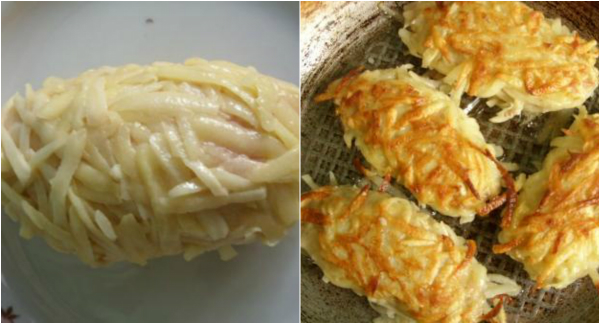 Ošúpte si zemiaky, nastrúhajte ich na jemno. Do inej misky si vyšľahajte vajce s múkou. Každý kus mäsa ponorte do vajca, potom obaľte v zemiakoch a napokon v nastrúhanom syre. Dobre zatlačte a vysmážajte do zlatista. Keď je mäso zlatisté, vložte ho do pekáča a nechajte piecť v rúre pri 180 stupňoch približne 15 minút. Prajeme dobrú chuť!