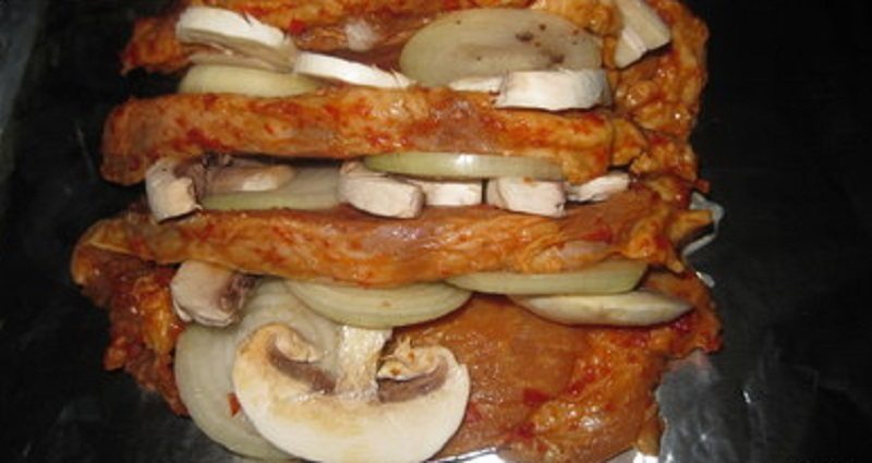 Mäso vyberte z chladničky a do zárezov naukladajte cibuľu, rajčiny a šampiňóny. Posoľte a okoreňte aj zvrchu a zvrchu mäso zľahka prelejte olejom. Dajte ho piecť do rúry vyhriatej na 200 stupňov na 45 minút. Po tomto čase mäso vyberte a zasypte ho tvrdým strúhaným syrom. Nechajte zapekať ešte 5-10 minút a potom krájajte. Prajeme dobrú chuť!