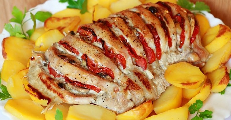 Mäso vyberte z chladničky a do zárezov naukladajte cibuľu, rajčiny a šampiňóny. Posoľte a okoreňte aj zvrchu a zvrchu mäso zľahka prelejte olejom. Dajte ho piecť do rúry vyhriatej na 200 stupňov na 45 minút. Po tomto čase mäso vyberte a zasypte ho tvrdým strúhaným syrom. Nechajte zapekať ešte 5-10 minút a potom krájajte. Prajeme dobrú chuť!