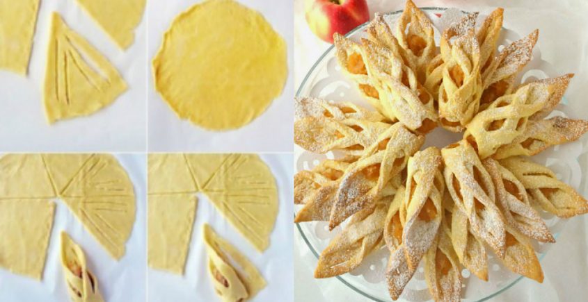 Všetko znova dobre premiešame a začneme miesiť cesto. Keď vymiesime hutnú hmotu, necháme prikryté cesto postáť asi 20 minút na chladnom mieste. Po uplynutí tohto času cesto vyvaľkáme a narežeme z neho (približne) rovnoramenné trojuholníky. Každý trojuholník narežeme (tvar obráteného písmena V bez spojenia vrchola) ako na obrázku. Potom do stredu trojuholníka dáme trochu jablkovej náplne a rohy trojuholníka pri jeho základni zlepíme, čím vytvoríme akúsi rolku. Z cesta si môžeme vyvaľkať aj kruh, ktorý potom narežeme na trojuholníky ako pizzu a tie potom po nadrezaní plníme.