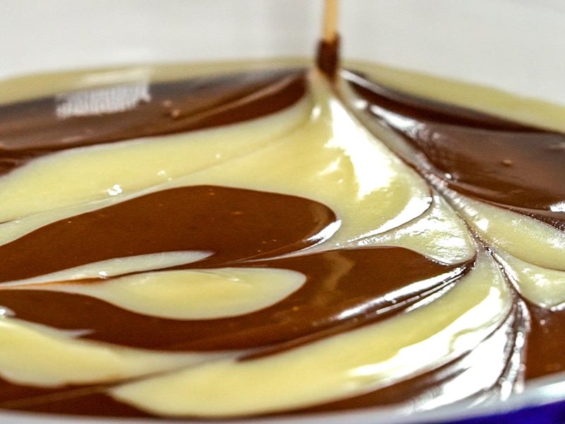 Upustime však od snenia a pustime sa do práce. Ak chcete pripraviť mramorovú polevu ako majster cukrár mali by ste si pamätať základnú vec. Konzistencia mramorovej polevy nezávisí len od pomeru čokolády a smotany, ale aj od druhu čokolády. Biela a mliečna čokoláda sú bohaté na čokoládové maslo a mliečny tuk, preto nepotrebujú veľa smotany, aby dosiahli hladkú zamatovo krémovú konzistenciu. Horká čokoláda si však pozornosti vyžaduje viac. Ak chcete ísť  na istotu, vypracovávajte svoju mramorovú polevu v kombinácii mliečnej a bielej čokolády. Ak vám ide o dokonalú chuť, poďte s nami skúsiť mramorovú polevu z tmavej čokolády.