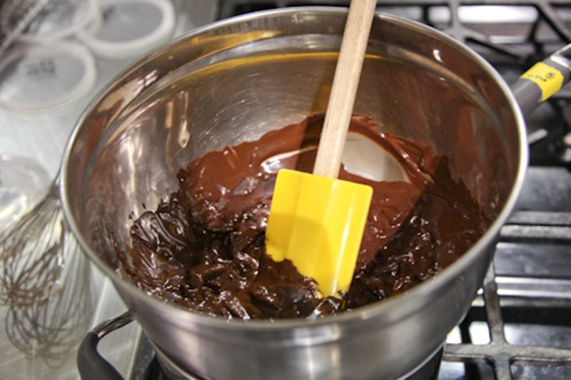 Poleva z horkej čokolády: V litrovom hrnci pomaly a za stáleho miešania priveďte do mierneho varu smotanu. V žiadnom prípade nesmie vrieť dlho. Keď začne bublať a na krajoch hrnca sa začne akoby lepiť, vylejte ju do misky k nasekanej tmavej čokoláde. Nechajte pol minúty postáť a potom začnite metličkou pomaly rozmiešavať. Keď sa čokoláda so smotanou spojí a vznikne tmavá poleva, nechajte ju odstáť pri izbovej teplote asi 8-10 minút.