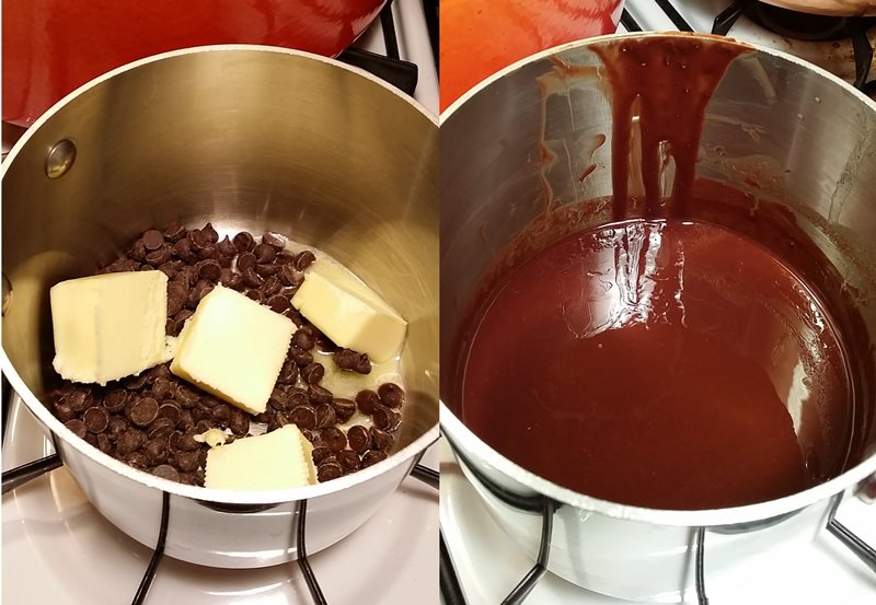 Maslo a čokoládu nasekanú na menšie kúsky si roztopte vo vodnom kúpeli. Roztopenú hmotu prelejeme do väčšej misky, kde budeme ďalej pripravovať cesto.