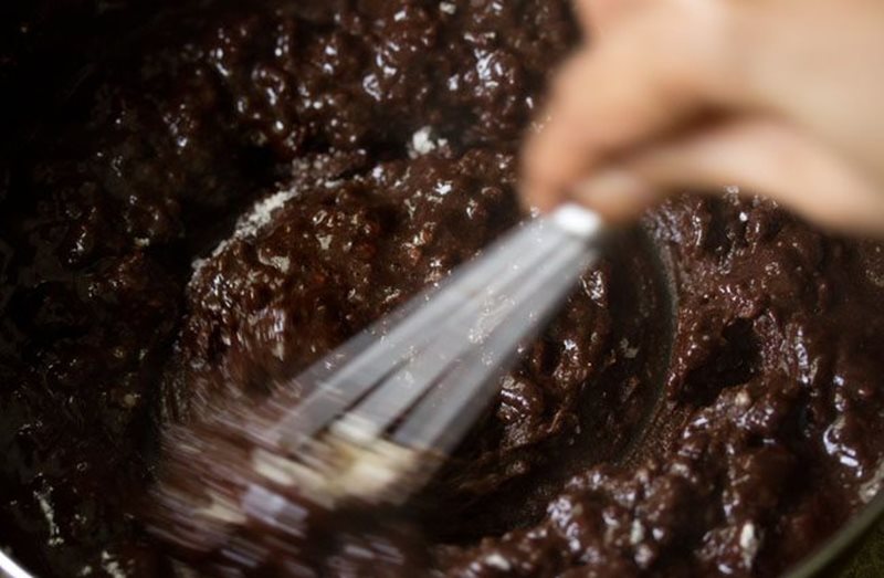 Do rozpustenej čokolády primiešavajte postupne vanilkový extrakt, cukor, vajíčka po jednom, soľ, múku a nakoniec oriešky.