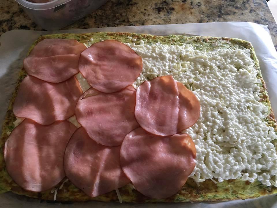 Následne hmotu necháme vychladnúť a natrieme ju tvarohom, posypeme mozzarellou a na vrch dáme šunku.