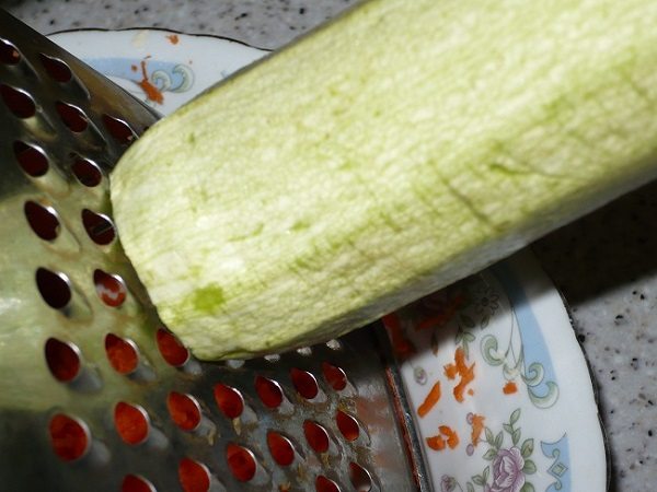 Cuketu si umyte, orežte kraje a ošúpte. Postrúhajte ju na jemnom, alebo hrubom strúhadle a dobre postláčajte, aby z nej stiekla všetka prebytočná voda.