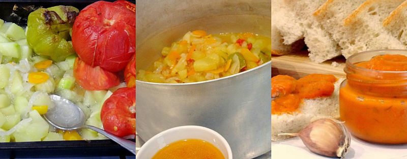 Na záver si pripravíme hlbokú panvicu, do ktorej si umiestnime upečenú zeleninu (dierkovanou naberačkou, aby sme nepridávali nadbytočnú šťavu – tú vylejeme do sklenených pohárov). Z papriky a paradajky odstránime šupku a pridáme k ostatným ingredienciám. Pridáme soľ, korenie, lisovaný cesnak, cukor a paradajkový pretlak a všetko varíme na miernom plameni približne 15 až 20 minút. Na záver zmes rozmixujeme na hladké pyré.