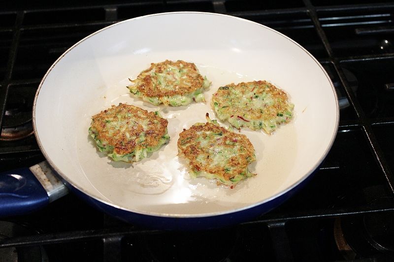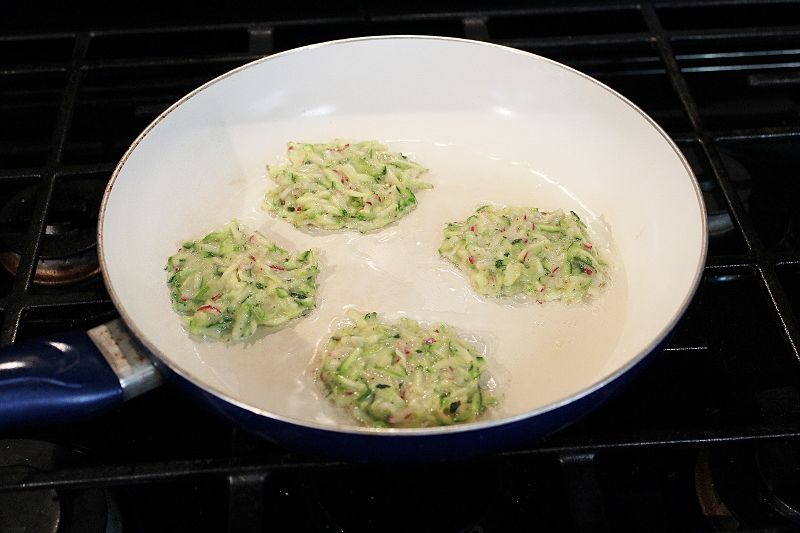 Potom si pripravte panvicu a rozohrejte a nej malé množstvo oleja. Lyžicou naberte z cuketovej zmesi a na panvici vytvorte malé placky. Keď sú placky menšie a tenšie, lepšie sa prepečú a otáčanie je jednoduchšie.