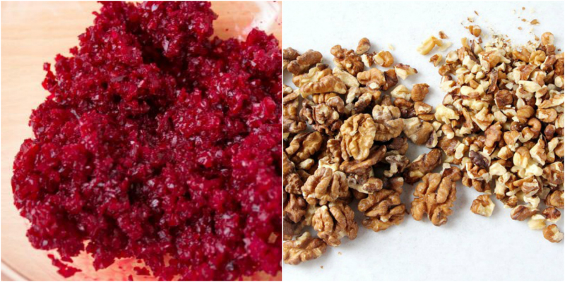 Uvarenú cviklu si postrúhame na hrubšom strúhadle. Vlašské orechy podrvíme na menšie kúsky, alebo jednoducho nasekáme nožom.