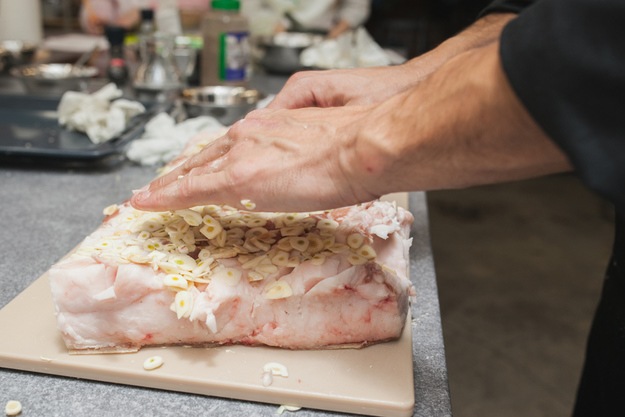 Strúčiky cesnaku si nakrájame na tenké plátky, ktoré potom dôkladne vkladáme do pripravených rezov v sadle.