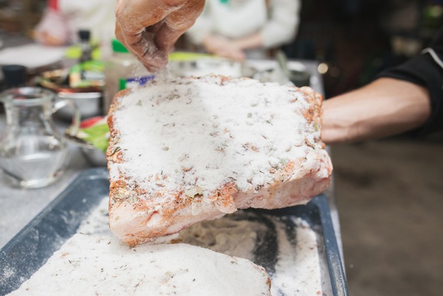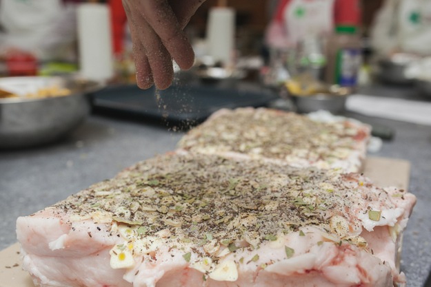 Zmesou korením potom posypeme povrch slaniny. Zvyšnú soľ sypeme tiež na povrch tak, ako vidíte na obrázku. Soľ môžete pokojne pridať, mala by sa vytvoriť soľná vrstva na povrchu sadla.
