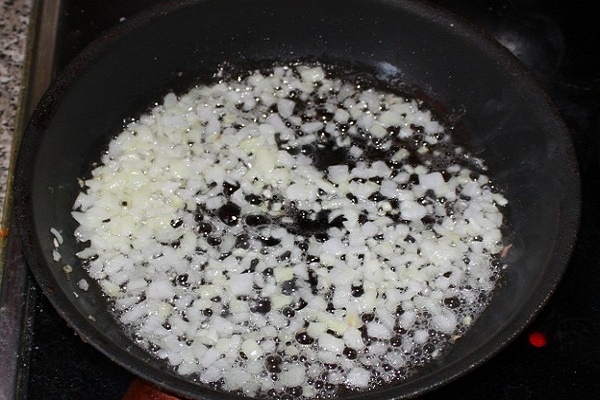 Medzitým si pripravte panvicu, rozohrejte olej a nasekajte doň cibuľu na drobno.Osmažte ju do sklovita.
