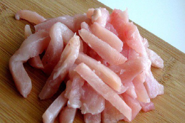 Nakoniec pridajte kuracie prsia nakrájané na hrubšie rezance.