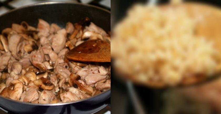 Po zatiahnutí mäsa pridajte šampiňóny nakrájané na menšie kúsky a nechajte podusiť. Osoľte a okoreňte a keď je mäso hotové, pridajte jačmennú kašu a všetko spolu dobre premiešajte.
