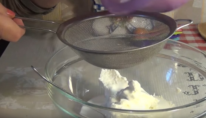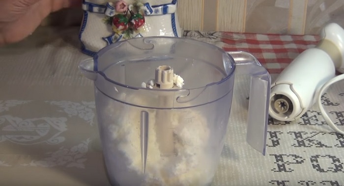 Pri príprave jednoduchých koláčikov začneme s tvarohom. Dôkladne ho vymixujeme v mixéri a pridáme 9 polievkových lyžíc cukru a soľ. Opäť všetko vymiešame.