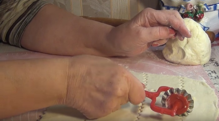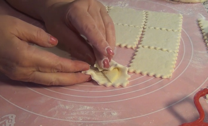 Cesto si vyvaľkáme približne do hrúbky 2-3mm a vyrežeme malé štvorčeky veľké asi 5x5cm.