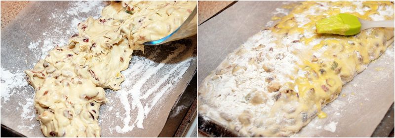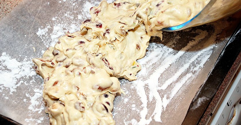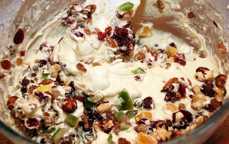 Keď je cesto hotové, pridajte doň kandizované ovocie, hrozienka a všetky oriešky. Všetko jemne premiešajte, aby sa ingrediencie rovnomerne dostali do cesta.