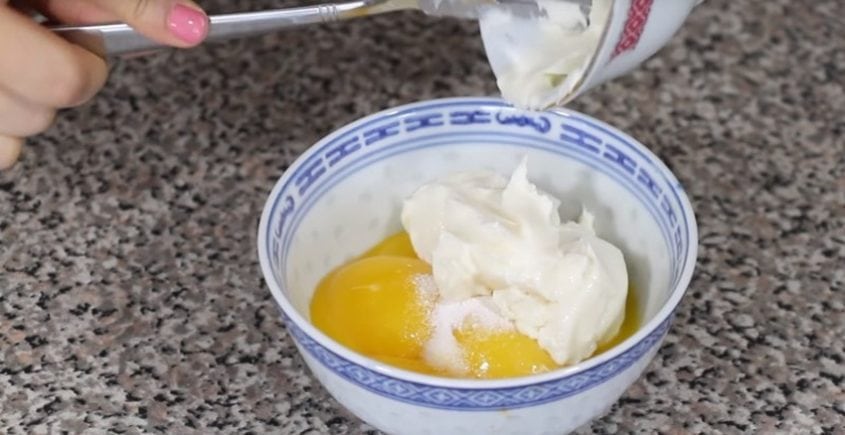 - V malej miske si zmiešane tvaroh (alebo syr) štipku cukru alebo stévie a 3 žĺtka. Do druhej väčšej misky pridáme prášok do pečiva a bielka. Zmes dôkladne rozmixujeme až nám vznikne sneh.