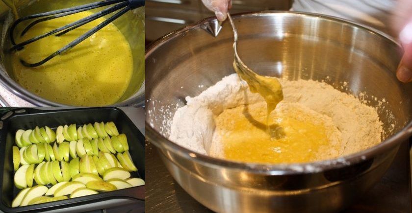100 g cukru vyšľahajte s vajíčkami a odložte na chvíľu nabok. Jablká si umyte, odstráňte jadierka a nakrájajte ich na tenšie mesiačiky. Naukladajte ich rovno do maslom vymasteného pekáča a posypte ich škoricou.