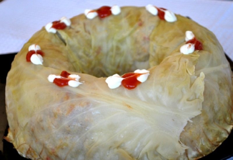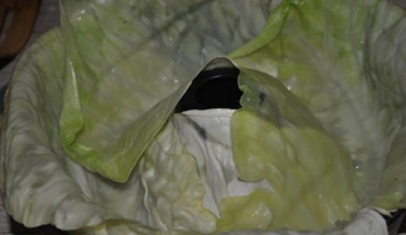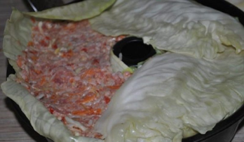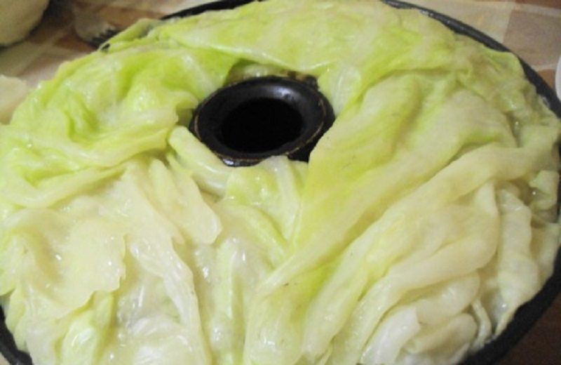 Oberieme vonkajšie listy kapusty a dáme ich variť do posolenej vody po dobu niekoľkých minút, kým nie sú mäkké. Pripravíme si formu na bábovku a vyukladáme ju uvarenými listami kapusty. Snažíme sa, aby boli všade rovnomerne.