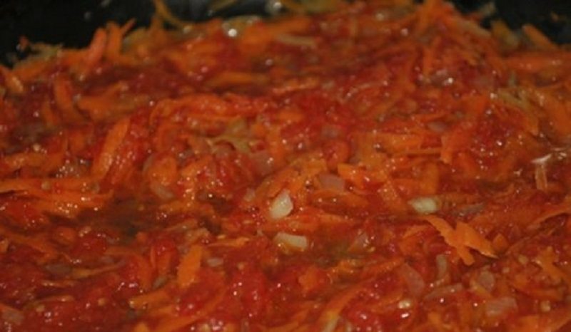 Cibuľu si nakrájame na jemno, mrkvu nastrúhame a dáme do hrnca spolu s paradajkovou šťavou, alebo zriedeným pretlakom. Zmes dobre premiešame, privedieme do varu a necháme variť po dobu 5 minút.