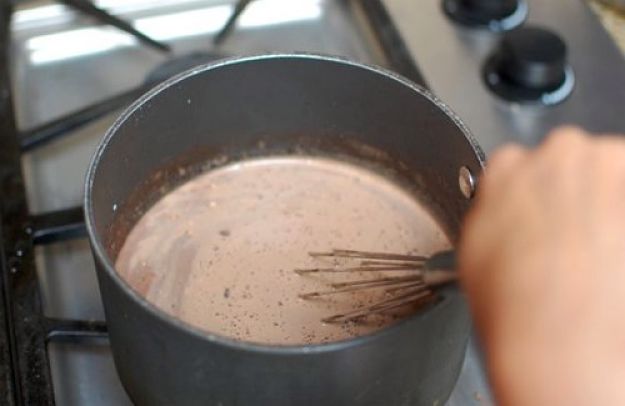 Smotanu na šľahanie spolu s jednou lyžicou cukru mixérom vyšľaháme na šľahačku. Tú nanesieme na vrstvu čokoládového pudingu. Zákusok je už takmer hotový. Ako posledné si pripravíme karamelovú polevu. Cukor na miernom plameni za stáleho miešania roztápame, až pokiaľ nezačne karamelizovať.