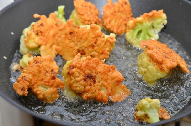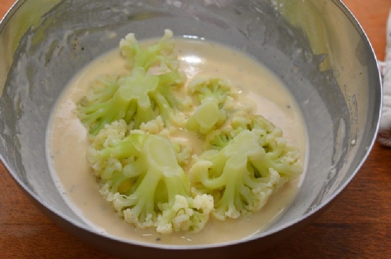 Vychladnutý karfiol obaľujte v cestíčku a ukladajte do panvice s rozohriatym olejom. Opekajte na miernom ohni do zlatista zo všetkých strán.