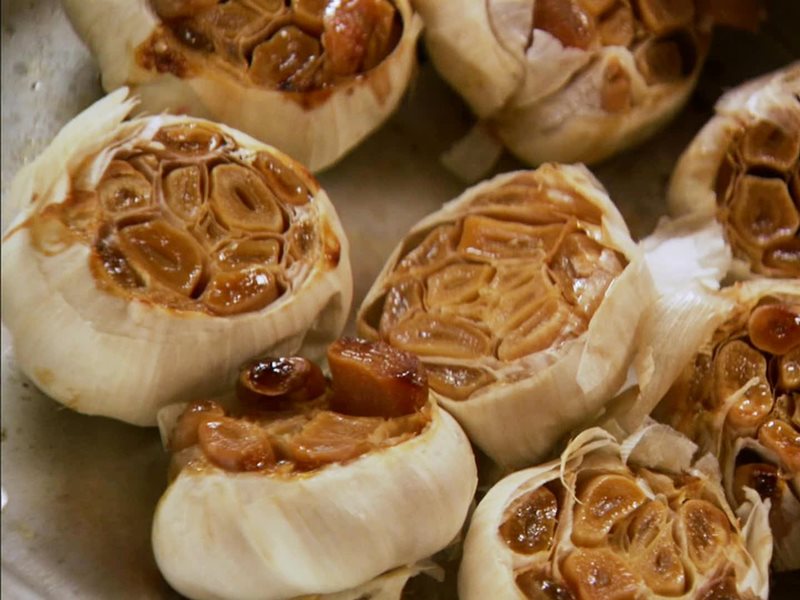 V hodinovom predstihu si predpečte cesnak. Rúru si predhrejte na 190 stupňov. Z cesnaku odrežte spodnú tvrdú časť a odstráňte z neho prvú vrstvu šupky. Na pekáč si položte alobal, naň dajte cesnak a pokvapkajte ho olivovým olejom. Trochu osoľte a okoreňte a dajte piecť. Pečte podľa potreby tak, aby bol cesnak zlatistý na odrezanom konci. Trvá to približne 50 minút, ale niektoré rúry ho upečú oveľa rýchlejšie.