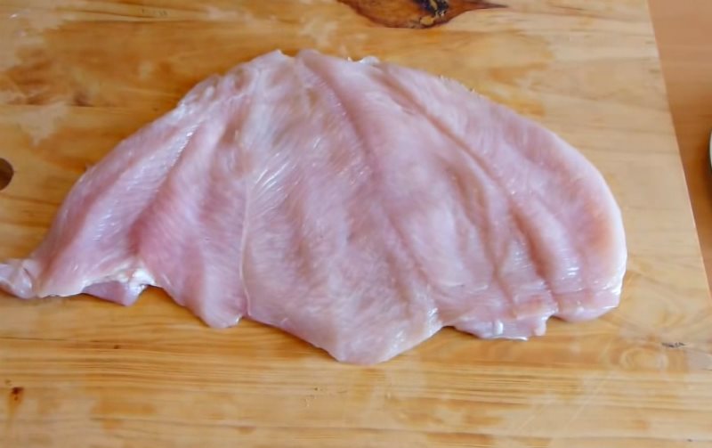 Pracovnú dosku, alebo väčšiu dosku na krájanie si prikryjeme alobalom, alebo potravinovou fóliou. Kuracie prsia si opláchneme, jemne usušíme, rozrežeme na tenšie a rozprestrieme na pripravený alobal, alebo fóliu. Zľahka osolíme a okoreníme a môžeme pridať nasekaný rozmarín, alebo bazalku.