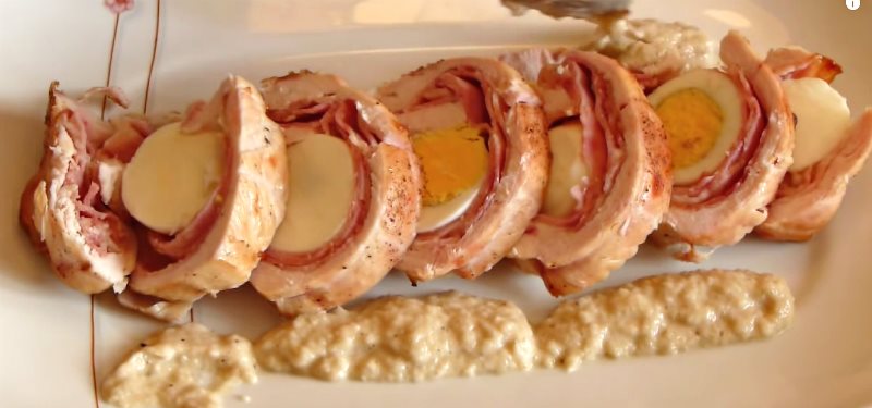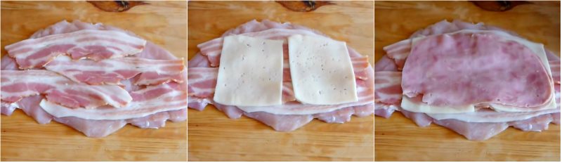 Kuracia rolka je úžasne jemná a šťavnatá so slaninkou. Táto ingrediencia dodá vášmu jedlu delikátnu chuť, preto ju určite použite. Uložte plátky slaniny na kuracie prsia, na ňu položte plátky syra a naň plátky šunky.
