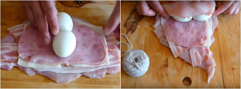 Uvarené a vychladnuté vajcia osušíme, aby sa príliš nekĺzali a položíme ich do stredu mäsa. Opatrne celé mäso zatočíme a spojíme konce tak, aby sa nerozchádzali (u nás ich spájame menšími ihlicami na mäso, ale môžete použiť aj špajdle, či špagátik. Dôležité je hlavne to, aby bola rolka na oboch koncoch uzavretá.
