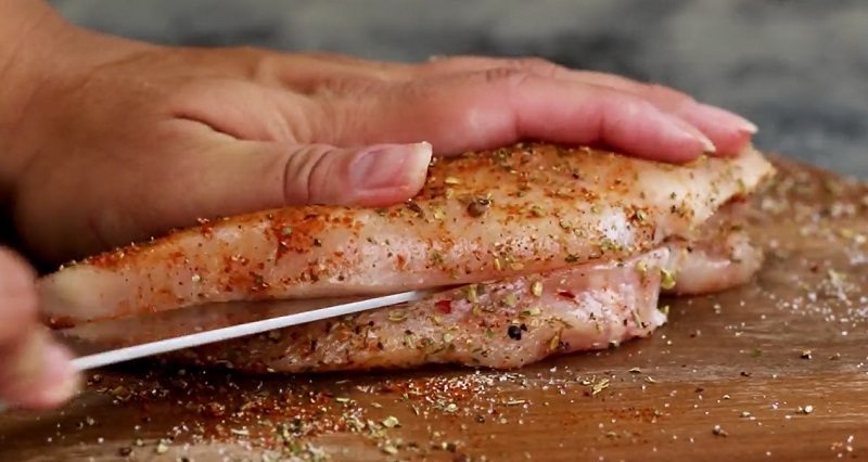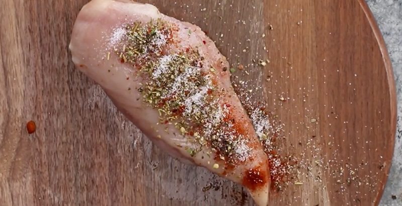 Kuracie prsia opláchnite a všetky pozdĺžne prerežte na dve polovice. Do stredu naplňte plnku a navrch mäsa dajte provensálske bylinky a soľ.