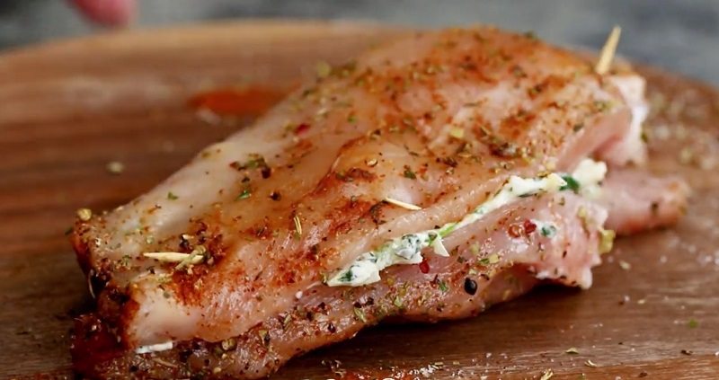 Potom mäse spojte špáradlami, aby plnka nevytiekla. Mäso ugrilujte na panvici do zlatista a na miernom ohni, aby sa dobre prepieklo aj zvnútra. Podávajte s čerstvou zeleninou. Prajeme dobrú chuť!