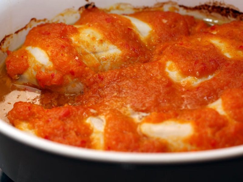 Pikantné kuracie prsia zapečené s omáčkou sú obľúbené najmä v Portugalsku. Základom je veľa pikantnej omáčky z čerstvých paradajok, no využiť môžete i pretlak. Nakrájajte cibuľu a censak, osmažte ich na oleji a pridajte paradajky bez šupky. Pridajte soľ, korenie a hlavne dostatok čili. Nechajte dusiť, pokiaľ sa paradajky nerozvaria a polejte nimi prsia uložené na plech. nezabudnite ale prsia pozdĺžne rozkrájať a naplniť tiež omáčkou a syrom. Výborný obed, ktorý ocenia milovníci pikantných jedál.