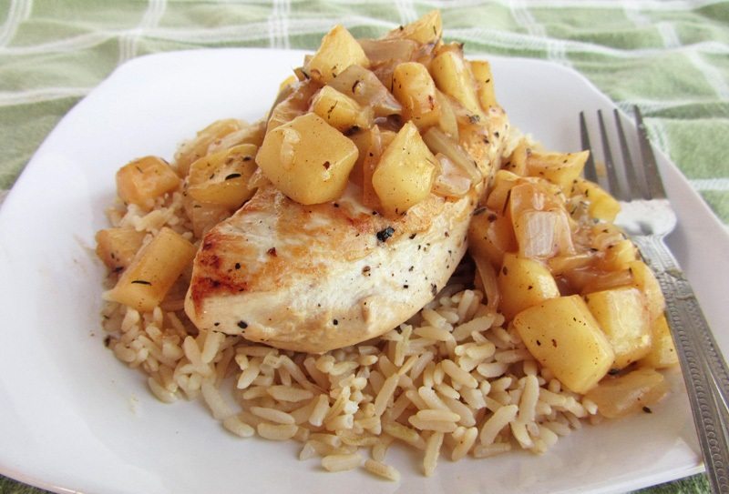 Jablká dodajú kuraťu zaujímavú chuť a šťava z nich je základom pre jemnú omáčku. Kuracie prsia osmažte na panvici a pridajte k nim nakrájané jablká. Nechajte chvíľu dusiť spolu s na jemno nakrájaným cesnakom a troškou paradajkového pretlaku. Na záver zamiešajte a obed je hotový. Podávajte s ryžou.