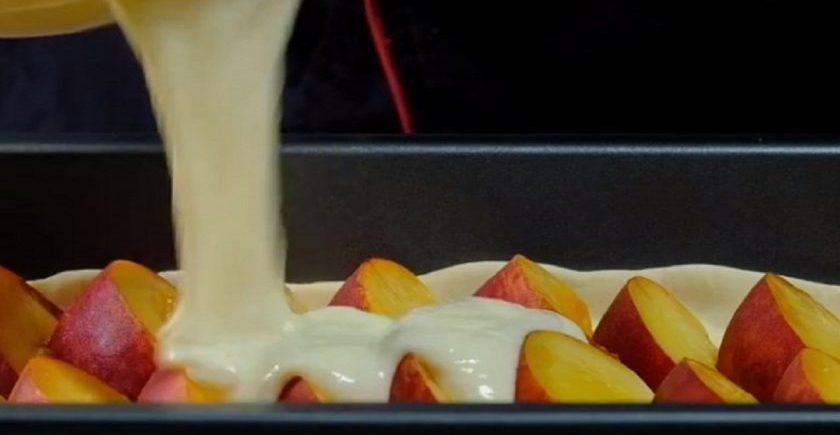 Broskyne umyte a osušte a nakrájajte pokojne aj so šupkou na stredne tenké plátky. Tie naukladajte rovno na lístkové cesto. Keď máte všetky broskyne na plechu, zalejte ich jogurtovou zmesou.