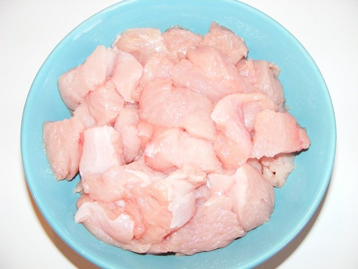 Morčacie mäso si umyte a narežte na väčšie kocky. Zeleninu umyte, cibule a šampiňóny očistite a všetko nakrájajte na približne rovnaké kúsky. Nekrájajte len cherry paradajky a menšie kúsky šampiňónov. Tie môžete nechať v celosti.