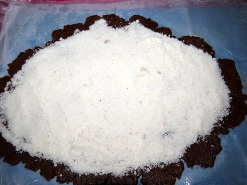 Sušienky rozmrvte na prach, pridajte kakao a premiešajte. V malej miske si zmiešajte kryštálový cukor a vodu a nechajte v mikrovlnke ohriať na 1 minútu, aby sa cukor rozpustil. Ohriatu sladkú vodu prilejte do sušienok a kakaa a zmiešajte, aby vám vznikla hustá hmota. Tá by mala byť nelepivá a malo by sa s ňou jednoducho pracovať. Ak je príliš hustá a rozpadá sa, opatrne po lyžičkách pridávajte navyše teplú vodu. Cesto vyformujte do bochníka.
