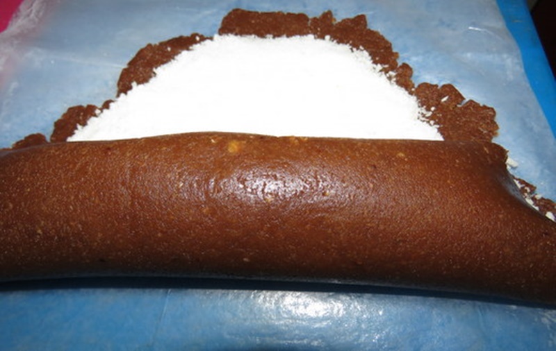 V miske si elektrickým mixérom vymiešajte zmes masla a práškového cukru. Miešajte, kým zmes nebude nadýchaná a potom pridajte kondenzované mlieko a kokos. Všetko dôkladne premiešajte a kokosovú zmes vyložte na rozvaľkané kakaové cesto. Opatrne rukami, alebo vidličkou, rozložte kokosovú plnku po celej ploche cesta. Od okrajov si nechajte cca 1 cm miesto, aby vám pri rolovaní plnka nevybiehala.