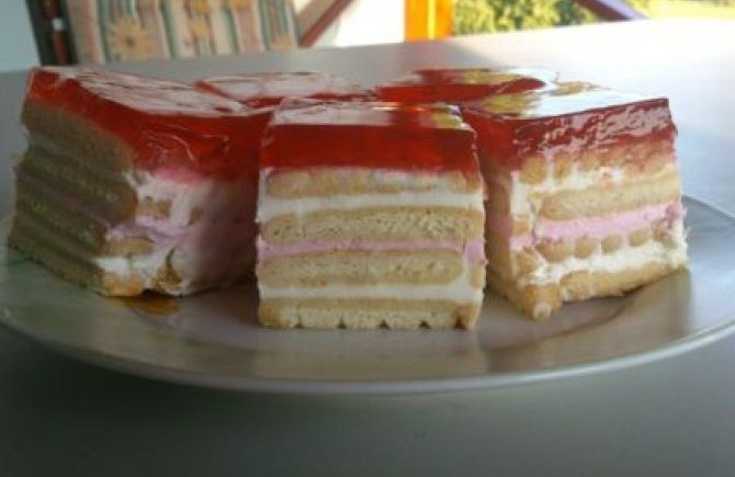 Druhú časť smotany zmiešajte s jahodovým džemom. Ak nemáte radi jahody, použite akýkoľvek iný džem. Ružovú časť smotanového krému natrite na druhú vrstvu sušienok a naň naukladajte tretie poschodie maslových keksíkov.