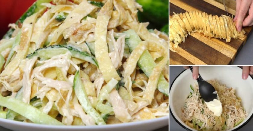 Ak milujete netradičné jedlá, tento šalát je pre vás ako stvorený. Vychutnajte si ho na studeno kedykoľvek vám naň príde chuť. Je rýchly, ľahký a pritom sýty. Základom je palacinkové cesto a kuracie mäso. Ak sa pýtate o čo ide, dobre sledujte recept. Nebudú to palacinky na slaný spôsob.